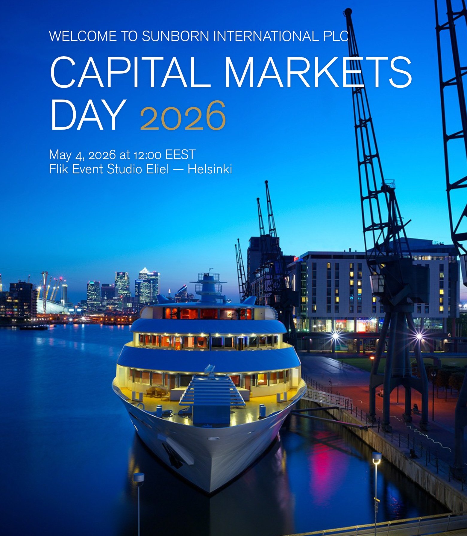 Sunborn International järjestää sijoittajille, analyytikoille, muille pääomamarkkinoiden edustajille ja medialle suunnatun pääomamarkkinapäivän maanantaina 4.5.2026 klo 12.00 Suomen aikaa.
